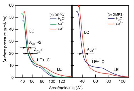 对于1 M Ca2+溶液上的DMPS单分子膜,与观察到的纯水共存区的π)10 mN/M压力相比,LE+LC平台压力降低到π)5 mN/M;在较高的表面压力(π>20 mN/m)下,两条等温线的位移保持等于Ca2+足迹,4Å2/脂,未观察到明显转变为2:1脂/Ca2+复合物。