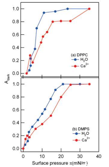 图4:。在净水(蓝色)和1 M CaCl2溶液(红色)上,DPPC(a)和DMPS(b)单分子膜的荧光图像中暗有序LC域的部分面积Adark随表面压力的变化。注意周围标记的局部最大值∼在存在Ca2+离子的情况下,两种脂质均为3 mN/m。