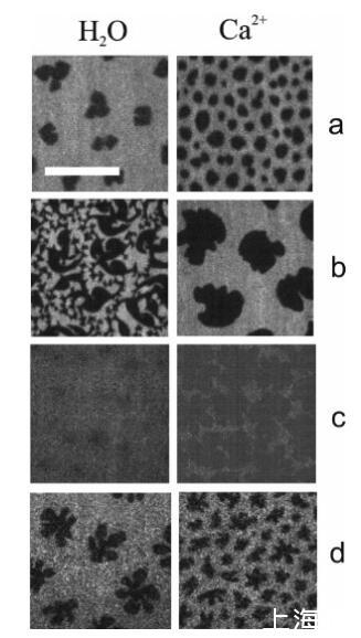 图3:水上DPPC(a、b、c)和DMPS(d)单层的荧光图像(左图)和1 M CaCl2溶液(右图),π)4 mN/M(a)、π)6.5 mN/M(b)、π)35 mN/M(c)和π)2 mN/M(d)。单分子膜用5 mol%罗丹明PE标记:亮区对应于LE相,暗区为LC结构域。比例尺代表15µm。所有图像的对比度都相同。