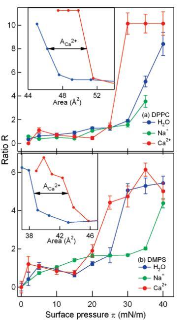 图6:。作为DPPC(a)和DMPS(b)单分子膜表面压力的函数,CH3和CH2对称拉伸振子强度的比值R:纯水(蓝色)、1 M NaCl溶液(绿色)和1 M CaCl2溶液(红色)。由于单分子膜的崩塌,在π)40 mN/m时,无法测定Na+-DPPC的比值R。由于压缩单层膜的νsCH2振幅的不确定性,在较高压力下,误差条较大。插图显示了作为每种脂质面积函数显示的比率R。请注意∼4Å2/脂质置换(解释为Ca2+足迹),与图2中的等温线一致。