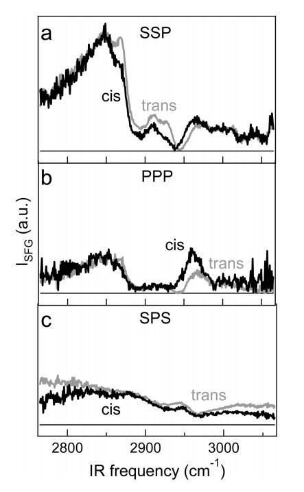图5:。(a)在P的反式和顺式状态下,DT-Azo-5P的纯单层在65Å2处的归一化VSFG光谱与SSP极化分别为6和20 mN/m。(b)与a部分类似,但PPP极化。(c)反、顺态SPS极化中的SFG谱(∼每分子78Å2),压力为2和15 mN/m。三个面板具有相同的垂直刻度。