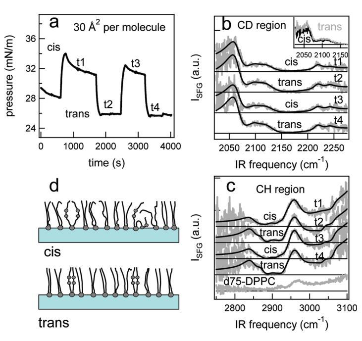 图7:。结果:对于1:5的DT Azo-5P/d75 DPPC混合物,在脂质/水界面上,每个分子的面积为30Å2。(a)表面压力与时间的关系。370和450 nm光照射∼100秒分别产生cis(高压)和trans(低压)状态。压力的微小剧烈波动是由于样品高度的变化,以校正水的蒸发。顺式状态下表面压力的降低可能是由于单层的松弛或胶束或囊泡的形成减少了表面的脂质量。(b)相应的VSFG光谱(灰色)以及CD区域的拟合。为了清晰起见,对光谱进行了偏移。插图显示了相互重叠的反式和顺式光谱,以强调差异。(c)VSFG光谱(灰色)与fits一起引导眼睛进入CH区域。底部曲线显示了P下纯d75 DPPC的光谱∼40 mN/m.(d)脂尾方向示意图。光开关脂质的偶氮苯部分用灰色圆圈表示。