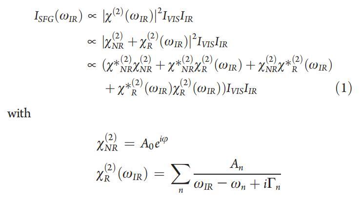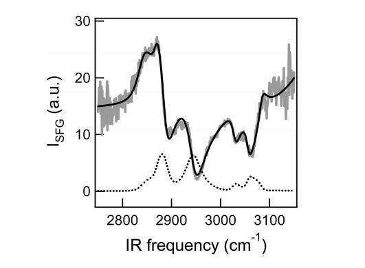 图3:。在密度为75Å2/分子和压力为∼3 mN/m。共振信号叠加在大型非共振背景上,由于共振信号和非共振信号之间的干扰,导致色散线型。黑色虚线表示NR振幅设置为零时的DT Azo-5P信号。
