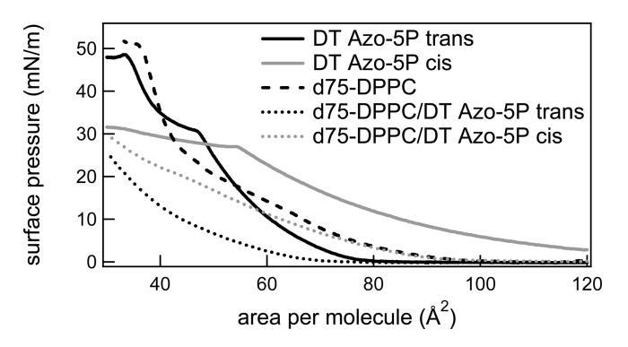 图2:反式和顺式状态下的光开关脂质DT Azo-5P的表面压力与面积等温线(实线),d75-DPPC的表面压力与面积等温线(虚线),以及光开关两种状态下的1:5摩尔比的光开关脂质与d75 DPPC的表面压力与面积等温线(虚线)。