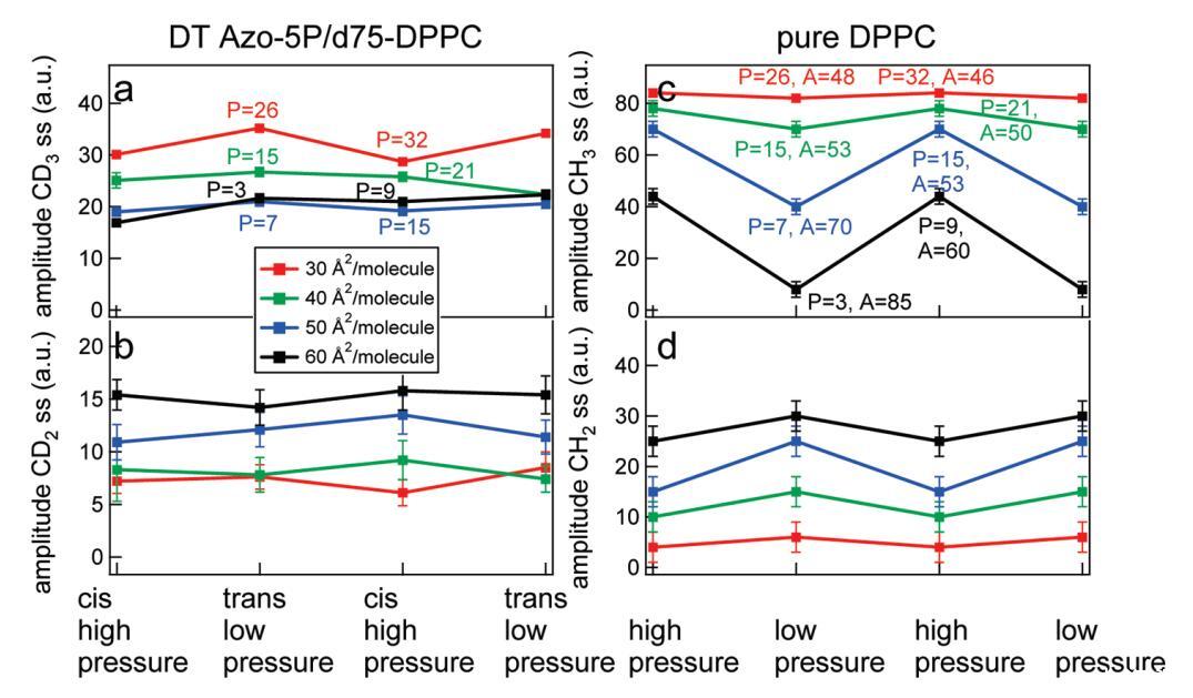 图8:。d75 DPPC与DT Azo-5P比例为5:1的实验中d75 DPPC的拟合结果(左)和纯正常DPPC的拟合结果(右)。(a)CD3对称拉伸振动模式的振幅随不同密度光开关脂质状态的变化;(b)CD2对称拉伸振动模式的振幅随不同密度光开关脂质状态的变化;右图显示了纯DPPC在可比压力下与左图相似的结果,其中(c)为CH3对称拉伸振动模式的振幅,(d)为CH2对称拉伸模式的振幅。共振的宽度和频率在拟合中是固定的。