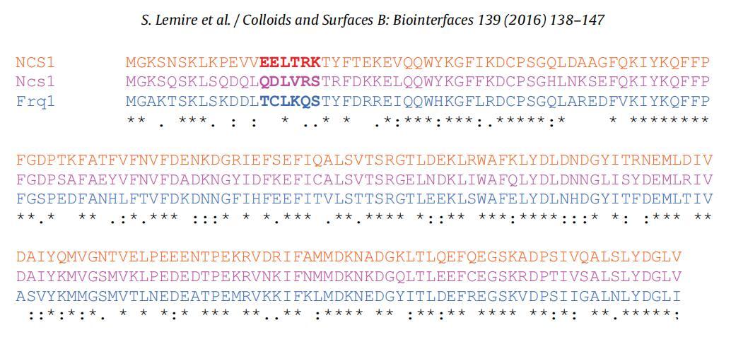 图1.人类NCS1(橙色)、裂变酵母NCS1(粉红色)和芽殖酵母Frq1(蓝色)的序列比对。在钙存在和不存在的情况下,负责肉豆蔻基挤出的基序用红色表示[29](为了解释本图例中对颜色的引用,读者请参阅本文的网络版本)。