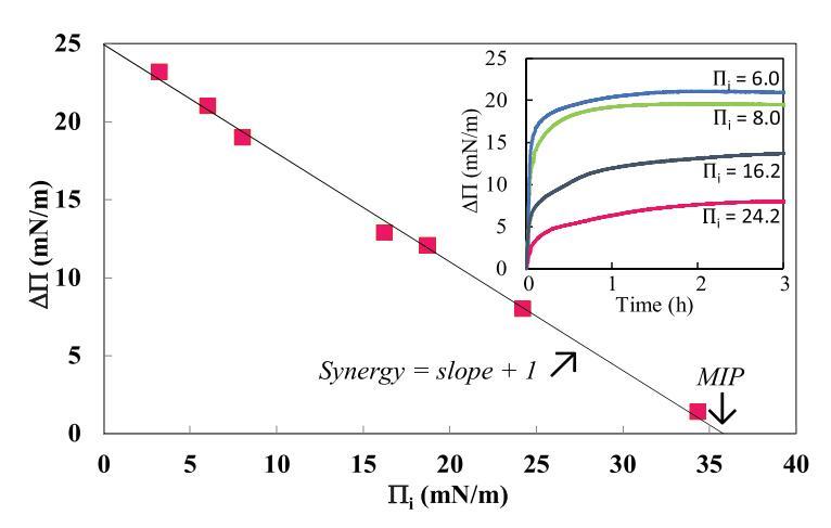 确定绑定参数的典型示例如图2所示。实际上,对于6.0、8.0、16.2和24.2 mN/m的i,分别获得了21.0、19.0、12.9和8.0 mN/m的(图2插图)。被绘制为i的函数,导致负斜率。因此,在DPPE存在的情况下,mNCS1的MIP值为35.8±1.1 mN/m,协同值为0.30±0.02。这种积极的协同作用表明mNCS1和这种脂质单层之间发生了积极的相互作用。然后,以不同的i注射每种脂质和MIP,并根据表面压力动力学计算协同值。