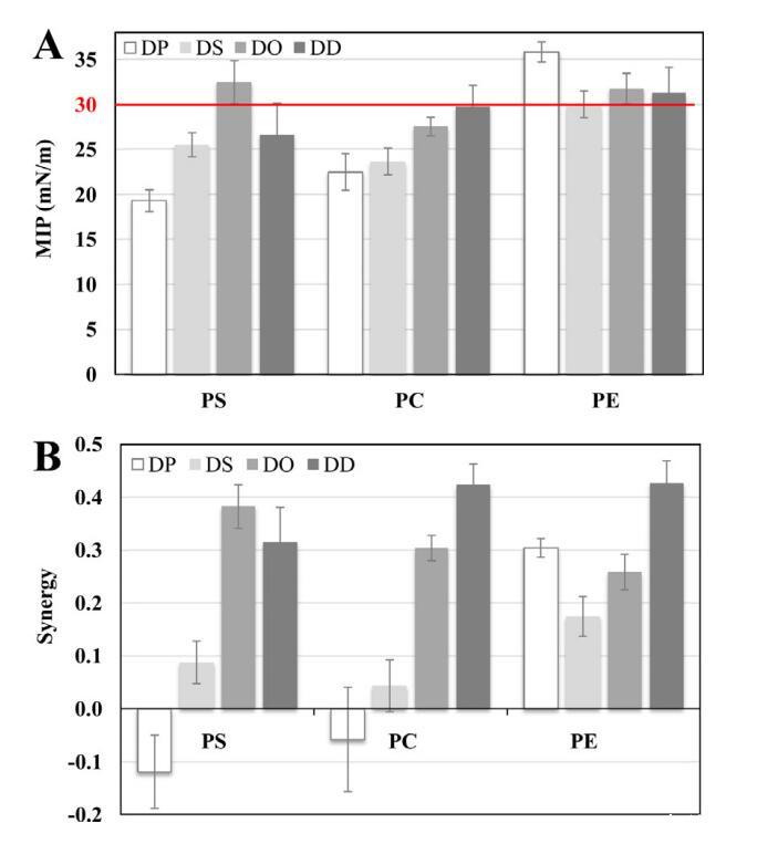 图3.在钙存在下,使用DPP、DSP、DOPS、DDPS、DPPC、DSPC、DOPC、DDC、DDPC、DPPE、DSPE、DOPE、DOPE和DDPE单层的mNCS1的MIP(A)和协同(B)值。MIP和synergy值的不确定性如第2.3节所述计算。