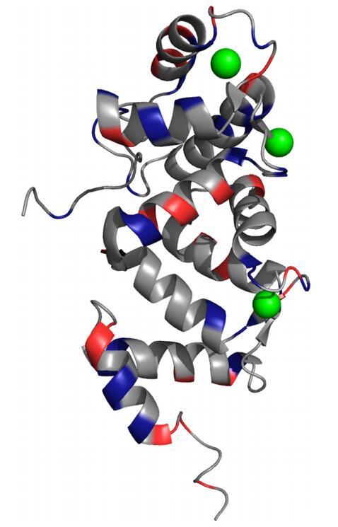 图4.nmNCS1结构上的正(红色)和负(蓝色)电荷(PDB 2LCP)[23](关于此图例中颜色的说明,读者请参阅本文的web版本)。