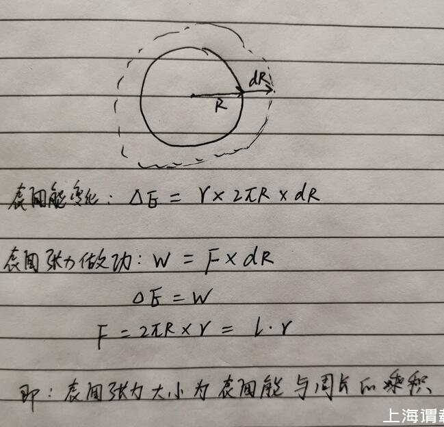 假设一半径为R的圆面向外扩张距离为dR,这个过程表面张力做功等于表面能的变化。具体推导如下图。