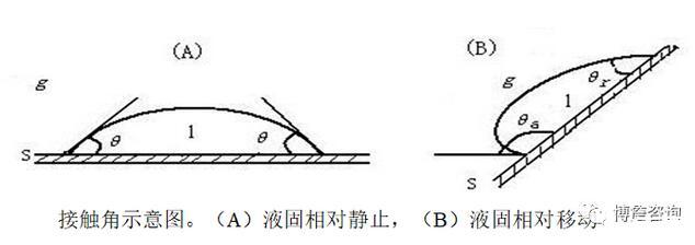 将一液体滴到一平滑均匀的固体表面上,若不铺展,将形成一平衡液滴,其形状由固液气三相交界面处所作气液界面之切线经液滴至固液界面所成之夹角决定,此角称为该种液体在所研究固体表面上之接触角,或称润湿角。接触角常以θ表示。