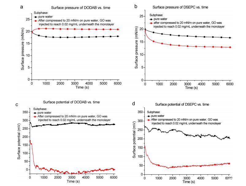 图2:(a)DODAB和(b)DSEPC单层的表面压力与经过时间。(c)DODAB和(d)DSEPC单层的表面电位与经过时间的关系。黑色曲线:在纯水亚相上将单层压缩至20 mN/m的表面压力。红色曲线:将单层压缩至20 mN/m后,小心地将600μL 1 mg/mL GO分散液缓慢注入单层下方的水亚相中,使GO达到0.02 mg/mL。