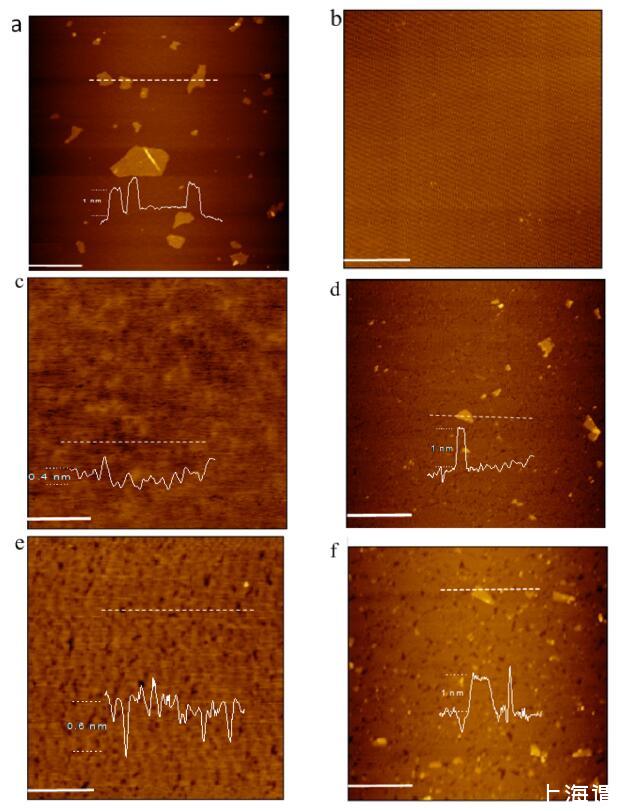 图5.新切割云母表面上的AFM图像(比例尺=1μm):(a)干燥后的一滴GO分散液;(b)LB膜在空气中不沉积脂质的对照实验−GO-水界面;(c)从空气中转移的DODAB LB膜−纯水界面;(d)从空气中转移的DODAB LB膜−GO-水界面;(e)从空气中转移的DSEPC的LB膜−纯水界面;(f)从空气中转移的DSEPC的LB膜−转到水界面。所有脂质LB膜在20 mN/m的恒定表面压力下转移。