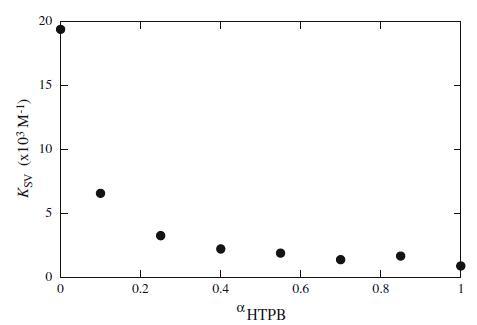 KSV值根据公式20(数据未显示)的斜率进行评估,如图6所示。图6显示KSV的值随着HTPB成分含量的增加而降低,反映出荧光团变得更难接近猝灭剂。据报道,随着阳离子gemini表面活性剂摩尔组成的增加,KSV降低[24]。