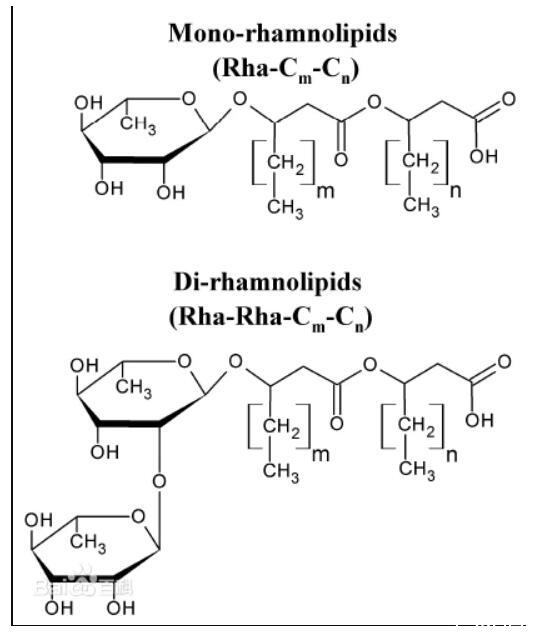 鼠李糖脂的结构多达几十种,一般在学术界经常看到双鼠李糖脂和单鼠李糖脂的表述。