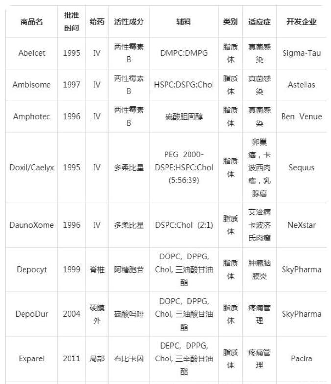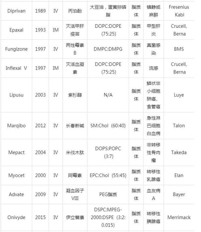 由于EPR效应,脂质纳米粒在肿瘤中的蓄积使得纳米颗粒在肿瘤细胞附近选择性地释放抗肿瘤药物。Doxil是最早获批的抗肿瘤纳米制剂,也是最早获批的脂质体药物。该产品可以改善蒽环类药物阿霉素的药代动力学和生物分布,阿霉素是一种强效抗癌剂,但具有心脏毒性。Doxil利用EPR,使用空间稳定的纳米颗粒(~100 nm)来延长药物在血浆中的循环时间,同时降低多柔比星的心脏毒性。Doxil作为静脉注射剂开发,由大豆磷脂酰胆碱、胆固醇和DSPE-PEG2000组成,用于治疗晚期卵巢癌、多发性骨髓瘤和HIV相关的卡波西肉瘤。