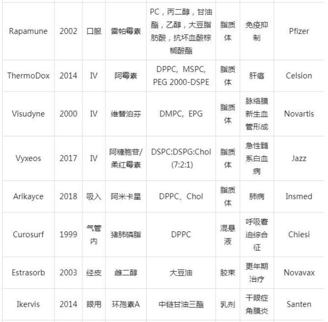 化妆品行业是最早认识到并在各种产品开发中采用先进纳米技术的行业之一。所期待的脂质化妆品制剂的优势包括增强这些制剂的稳定性和功效,以及促进成分渗透到皮肤中。目前仍有多种市售的脂质化妆品还在使用。最早加入脂质体的产品是迪奥于1986年推出Capture,在大豆卵磷脂脂质体中含有胸腺提取物、胶原蛋白、弹性蛋白肽和透明质酸。另一种在脂质体递送制剂中含透明质酸的产品是雅诗兰黛推出的深夜修复保护复合体(Advanced Night Repair Protective Recovery Complex),该产品可以抵消和修复由紫外线产生自由基造成的损伤,并具有保湿作用。欧莱雅也推出一种含有前视黄醇A的抗皱脂质体产品Revitalift Double Lifting。国际化妆品公司Jafra的蜂王浆浓缩液(Royal Jelly Lift Concentrate)是包含氨基酸、维生素和矿物质的复杂混合物脂质体,可刺激细胞更新并防止皮肤起皱。在商业化产品中,脂质体制剂还与各种提取物、保湿剂、抗生素和蛋白质一起用于伤口愈合、晒伤缓解、护发素、抗衰老产品和长效香水等用途。