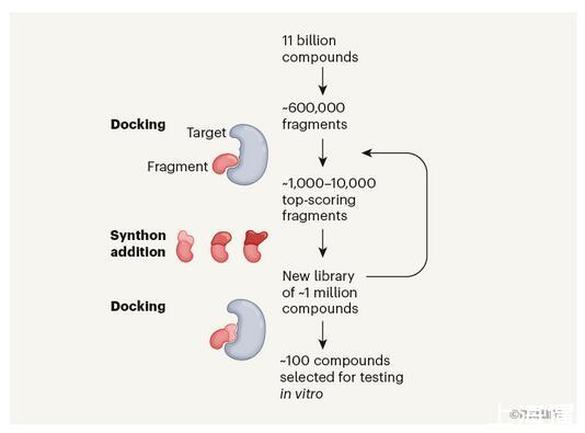 通过重复对接和添加合成子的步骤,筛选几百万个化合物来确定hits。随着每一次迭代,每个化合物的大小都会随着分子变得更加完整而增加。