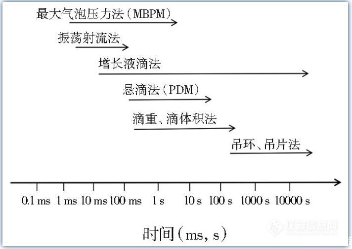 由于对DST时间范围界定的不同,可运用的测量手段也有所不同。王建坤等认为,在达到静态表面张力前的表面张力变化都可算是DST,这个时间范围以几毫秒到几小时计。可用Wilhelmy吊片法、DuNouy吊环法、滴重法、滴体积法、悬滴法、最大气泡压力法测定DST。