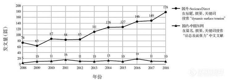 当研究的液体吸附过程在快速、持续进行,且短时间内无法达到平衡时,对液体DST的研究比静态表面张力更有意义。如在农药喷洒、喷墨印刷、织物快速润湿,以及摄影用薄胶片制备中。图1对比了近10年(2008~2018年)国内外发表的以DST为主要考察项的论文数。数据显示国内在DST方面的研究较少且总体波动不大,而国外则呈持续上升趋势。
