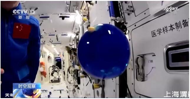 在泡腾片实验中,王亚平向注入蓝色颜料的水球中放入泡腾片,泡腾片入水后产生大量气泡。