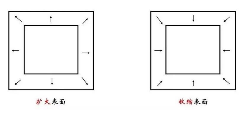 油墨不溶于水,当它接触到水的一瞬间就会立刻扩散开来。油墨的扩散会带来水表面上面积的增大,如下图所示。而扩大表面就会给船带来一定力的作用,从而造成船的运动。