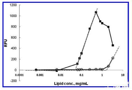 图2.在不同浓度的脂质diC8PS下记录的荧光发射,范围从64μg/mL到3.47 mg/mL。在对照中,添加纯DMSO代替测试化合物(O),1.1 mg/mL的急剧上升标志着diC8PS的CMC。将10μL的10 mM硫利达嗪(9)引入基质(20 mM HEPES缓冲液中的diC8PS),CMC转移到较低浓度(0.042 mg/mL)。RFU:相对荧光单位。