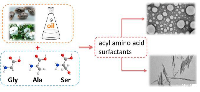 尤其是阴离子型N-酰基氨基酸表面活性剂因其良好的理化性质和抗菌活性[7,8]被广泛应用于个人护理用品、化妆品、家居用品、洗涤剂等各个领域[9]。.据报道,这些表面活性剂在疏水作用和氢键作用下自组装成各种形状的聚集体,酰胺键既是供体又是受体[2,10,11]。因此,对其物理性质的研究N-酰基氨基酸表面活性剂既有实际意义,也有理论意义。传统上,N-酰基氨基酸表面活性剂是通过与脂肪酰氯和氨基酸在高温下反应的Schotten-Baumann反应生产的[12]。该过程中使用的酰氯有毒,不能消除不良副产物和气味。