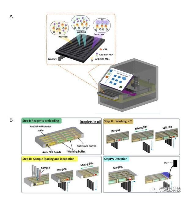 图2液滴阵列微流控芯片免疫分析系统。A.分析仪器结构示意图;B.分析原理示意图。