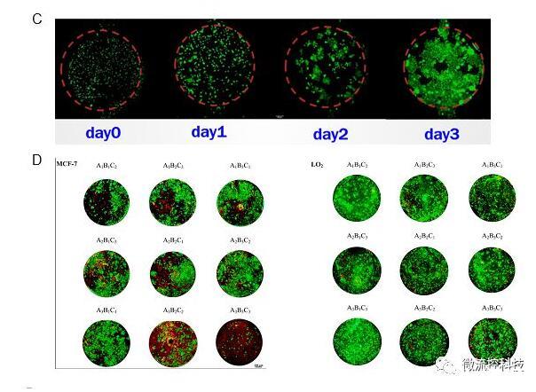 图4A.微流控肿瘤微阵列药物测试系统包含一种复合式结构开放式微流控芯片以及移液工作站;B.微流控芯片上肿瘤微环境重建的示意图。3D培养肿瘤细胞模拟肿瘤实质,水凝胶模拟支持和滋养肿瘤细胞的肿瘤基质,纳米孔薄膜扩散屏障模拟血管内皮层;C.微流控芯片上连续三天内MCF-7乳腺癌细胞增殖情况。(Calcein-AM/EthD-1染色,比例尺:200μm);D.抗肿瘤药物正交组合测试结果。药物测试包括LO2肝细胞和MCF-7乳腺癌细胞对A.阿霉素,B.紫杉醇和C.顺铂的3因素3水平正交组合药物的反应。
