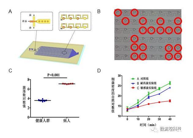 图3A.液滴微流控芯片原理设计图结构包含上游的液滴生成区和下游的液滴捕获区;B.利用液滴荧光成像分辨细菌阳性和阴性液滴;C.液滴数字化分析显示健康人和尿路感染病人尿液细菌计数差别;D.液滴数字化分析显示敏感和耐药细菌对于抗生素的反应。