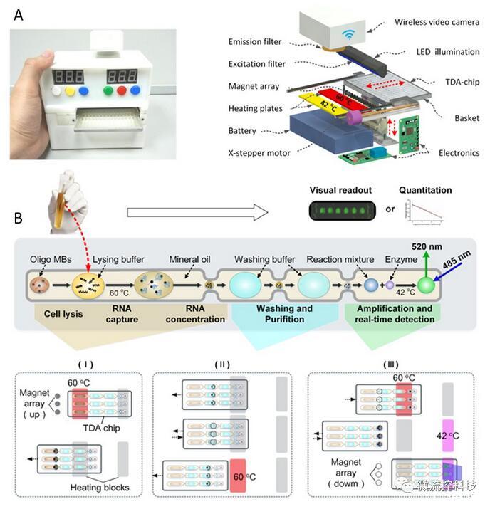 图1液滴阵列微流控芯片核酸分析系统。A.分析仪器实物及结构示意图;B.分析原理示意图。