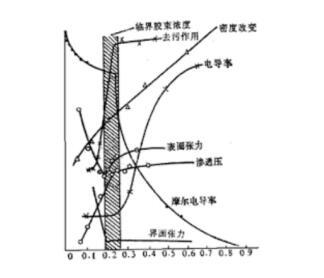 临界胶束浓度的英文表达为:Critical Micelle Concentration,可缩写为CMC。自从Mcbain于1925年首次提出胶束(团)的概念,认为当浓度升至一定值时,肥皂分子在水溶液中从单体缔合为“胶态聚集态”,并称之为“胶束”或“胶团”(图1)。所形成的这些胶束是热力学稳定的,从而将形成胶束时的浓度称为临界胶束浓度,简称为CMC。含有表面活性剂溶液体相中一旦形成了胶束或胶团后,溶液体相的一系列性质会发生改变(图2),例如摩尔电导率、表(界)面张力、去污力、渗透压以及增溶、吸附量等突变是因为溶液体相中出现了表面活性剂聚集态,这些性质的变异通常都发生于一个窄浓度范围,而将这个窄浓度范围定义为临界胶束浓度,获取的方法就是将CMC两侧溶液性质连续变化的曲线延长至相交,交点所对应的浓度为CMC。