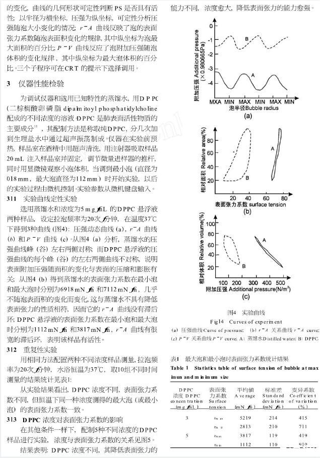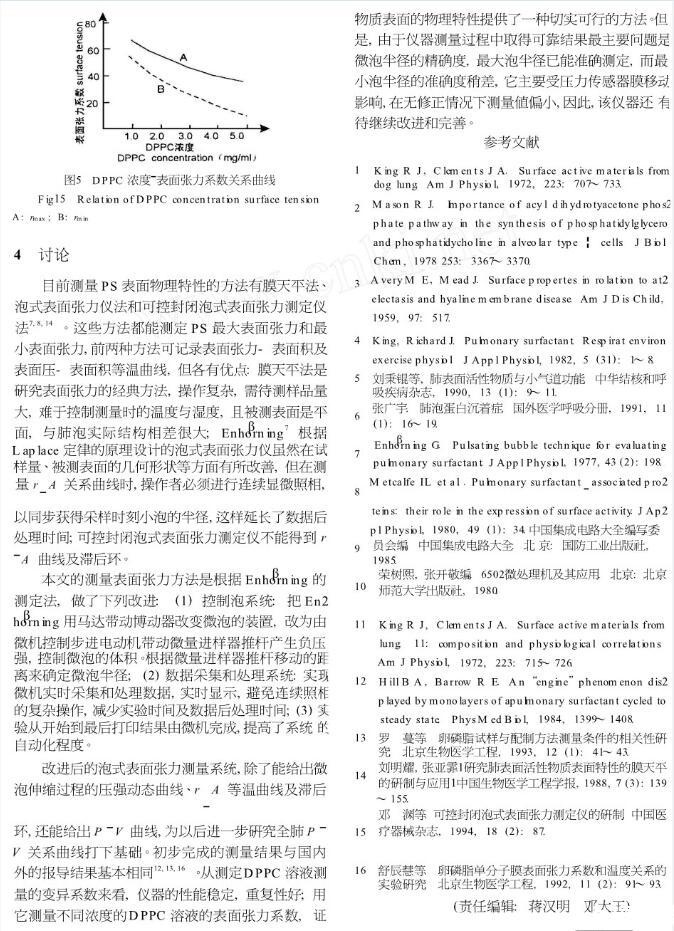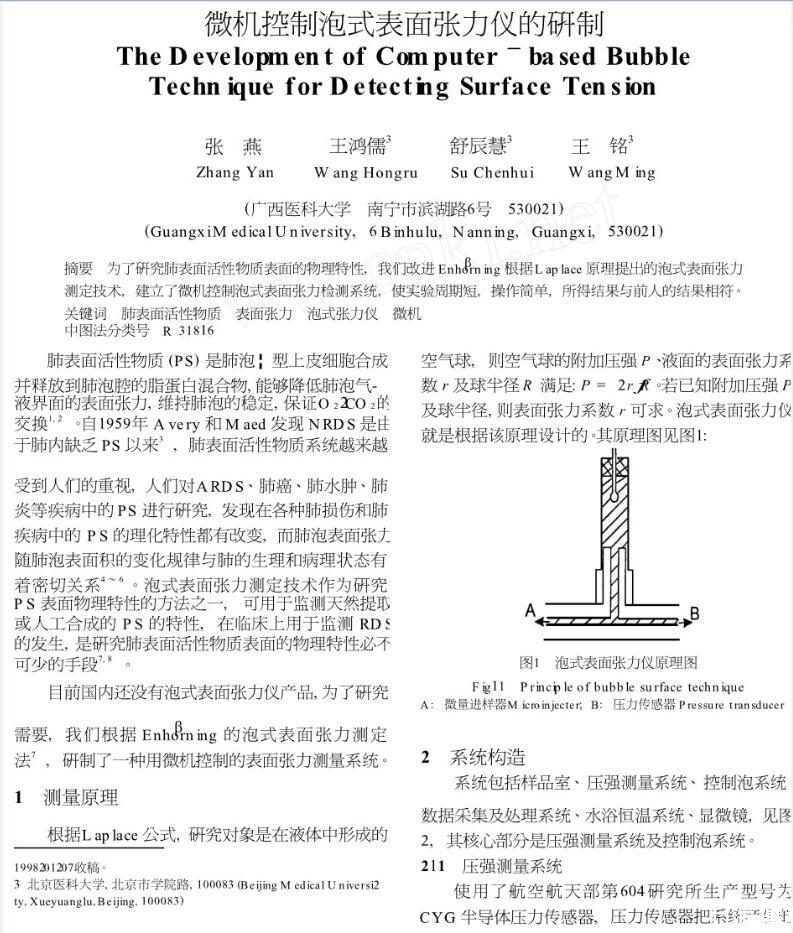 为了研究肺表面活性物质表面的物理特性,蜜桃性爱视频网站改进Enhorning根据Laplace原理提出的泡式表面张力测定技术,建立了微机控制泡式表面张力检测系统,使实验周期短,操作简单,所得结果与前人的结果相符。