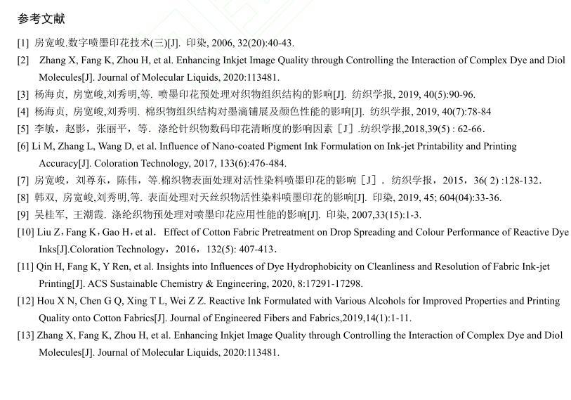 【摘要】:为了研究活性染料墨水黏度和表面张力对棉织物印花性能的影响,配制不同黏度和表面张力的活性红墨水,测试打印后织物的渗透率、K/S值、墨量及打印线宽等指标。结果表明:提高墨水黏度会降低墨滴在织物上的润湿和渗透性能,打印到织物的墨量减少,打印清晰度下降。不同黏度的墨水对打印线条经纬向的清晰度影响机制不同,表面张力对织物打印性能的影响比黏度小。