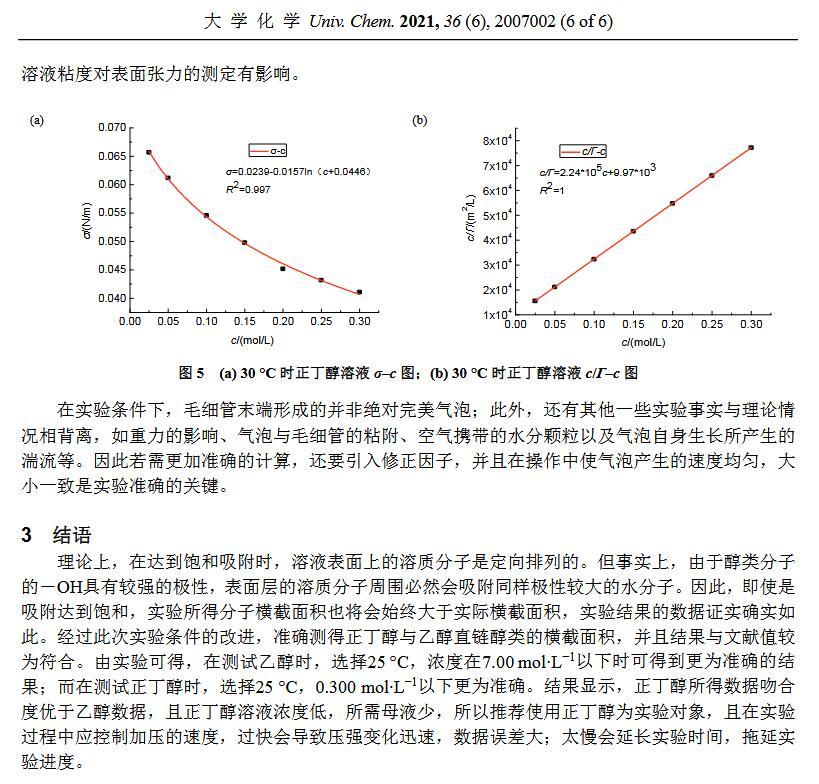 【摘要】:最大气泡压力法测定溶液表面张力是物理化学实验中的一个传统实验,由于各种因素的影响,导致学生实验结果存在较大偏差。本研究通过浓度、温度等作为变量进行实验条件探索而得到的结果与文献值较为吻合。