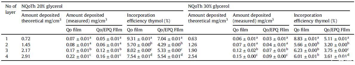 表3注射到薄膜Qo和Qo/EPQ中的百里酚量(mg/cm3)作为印刷次数的函数。不同字母表示显着差异(p<0.05)。