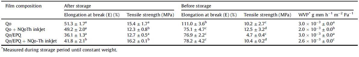 在储存前后测量了印有4层NQoThs的薄膜的机械性能和WVP,这些结果如表4所示。