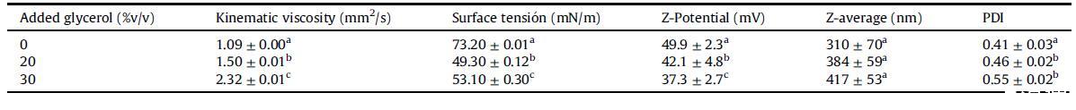 表2甘油对纳米颗粒悬浮液物理性质和纳米颗粒的粒径和zeta电位的影响。不同字母表示显着差异(p<0.05)。