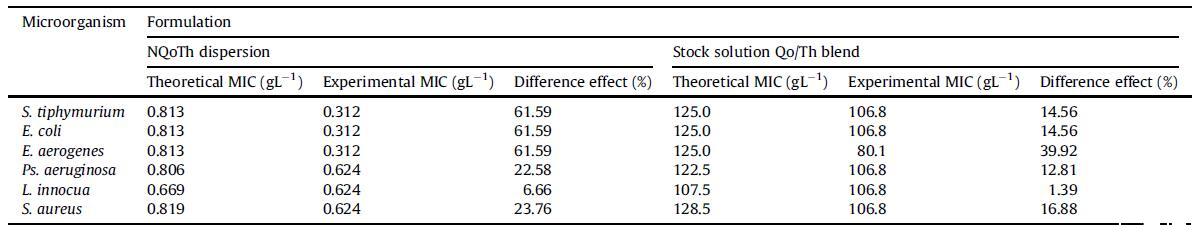 表5储备溶液NQoTh和Qo/Th混合物的分散对本研究中使用的微生物的添加剂或协同效应的定量评估。