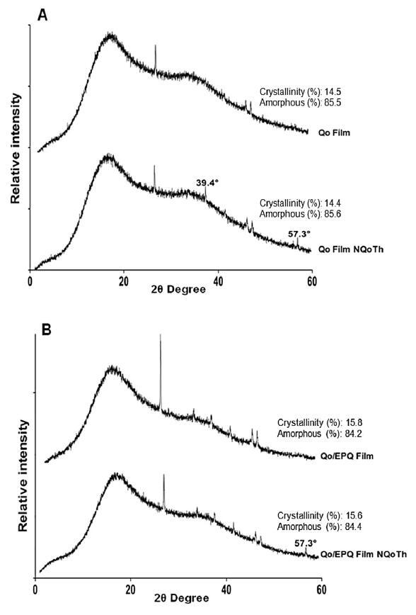 图4.(A)Qo薄膜控制和Qo NQoTh 11薄膜和(B)Qo/EPQ薄膜控制和Qo/EPQ NQoTh薄膜的X射线衍射曲线和结晶度(%)。