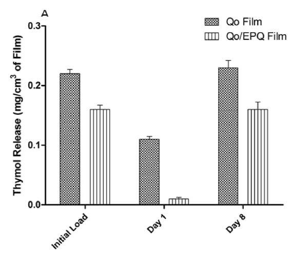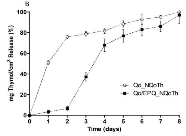 图6.从使用NQoTh印刷4次的薄膜Qo和Qo/EPQ中释放百里酚(A)0天(初始负载Th)、第1天和第8天的释放曲线和(B)室温下8天测定的百里酚释放动力学温度。