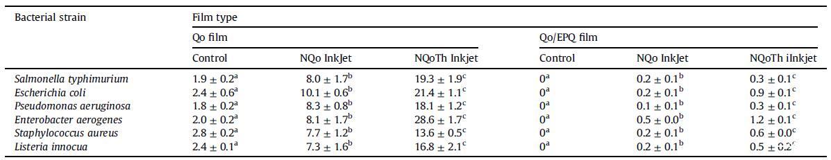 表6通过热喷墨将NQo和NQoTh结合到Qo和Qo/EPQ薄膜中的径向扩散的生长抑制区(mm2)。对于每种纳米颗粒溶液,薄膜印刷4次。不同字母表示显着差异(p<0.05)。