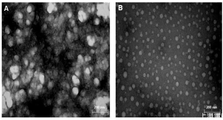 含30%(w/v)甘油(417.4±53.1 nm)的NP的Z平均值比含20%(w/v)甘油(383.8±58.8 nm)的NP观察到的高25%。尺寸通过TEM显微镜确定。图1显示了在没有甘油(图1A)和添加20%(w/v)甘油(图1B)的情况下NQoThs的显微照片。如上所述,添加20%甘油抑制了NP团聚。表2比较了TEM和动态光散射(DLS)确定的NP尺寸。使用DSL确定的值比TEM确定的值高近10倍,因为TEM直接测量干燥样品,而Zetasizer系统确定尺寸首先通过DLS测量样品中由于周围粒子轰击(布朗运动)而引起的液体中粒子的随机运动,然后使用StokeseEinstein方程(Akbari、Pirhadi和Zandrahim,2011年)从该运动中推断出大小。