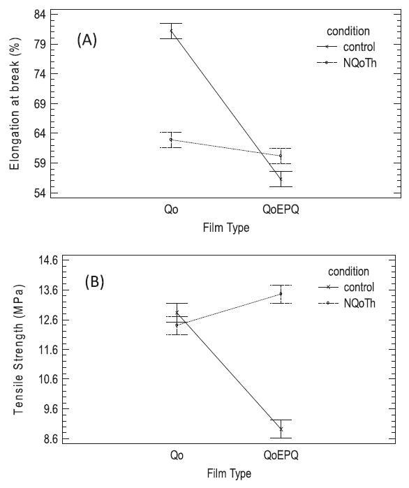 图5.Type Film和NQoTh之间的相互作用(A)断裂伸长率效应和(B)拉伸强度效应。