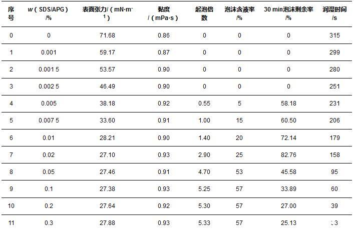 2)在SDS和APG构成的表面活性剂体系中,溶液表面张力的降低,有利于起泡、泡沫携液、泡沫稳定性和润湿能力的提升。当质量分数大于cmc时,表面张力几乎不变;在测定范围内,随着质量分数增加,溶液起泡能力呈现先增加后平稳的趋势,泡沫稳定性降低,润湿性能提升。