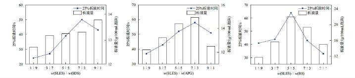 实验测得SLES,SDS,APG和BS在w=0.2%时的25%析液时间依次为33,30,21和25 s,100 mL泡沫析液量依次为15.97,12.92,13.69和10.89 g。由图4可知,SLES/SDS无明显增效,随着SLES质量分数的增加,复配组分的析液量和25%析液时间接近SLES单组分。SLES/APG的25%析液时间增加,泡沫稳定性较好,其中w(SLES):w(APG)=7:3的25%析液时间、100 mL泡沫析液量依次为58 s、14.92 g。SLES/BS的析液量和泡沫稳定性均有所提升,其中w(SLES):w(BS)=5:5的25%析液时间、100 mL泡沫析液量依次为64 s、21.95 g。