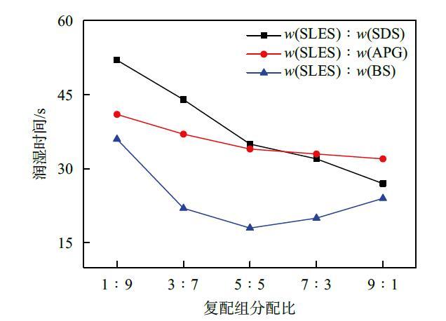 实验测得SLES,SDS,APG和BS在w=0.2%时的润湿时间依次为26,102,39和42 s。由图5可知,SLES与SDS、APG复配时,润湿性能未表现出明显的增效作用,润湿时间的降低可归因于SLES的润湿能力更好,因此随着SLES组分的增加,复配溶液的润湿时间降低。SLES与BS复配时,润湿能力表现出明显的增效作用,当质量分数比为5:5时,润湿时间为18 s,低于两种单一物质的润湿时间。