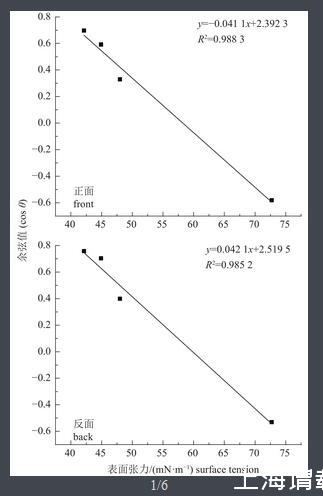 临界表面张力是固—液界面化学中表征固体表面能的一个重要指标,用以说明液体在固体表面的可润湿性。通过ZISMAN图法[22]以接触角的cosθ对液体表面张力作图得到接触角与表面张力的回归直线如图1所示:求得方程分别为y=−0.041 1 x+2.392 3和y=−0.042 1x+2.519 5。将图中直线外延至cosθ=1处,得出小麦叶片正、反面的临界表面张力值分别为33.88和36.08 mN/m,与顾中言等[21]研究结果几乎一致。从测定结果可以看出:小麦叶片的反面表面张力值比正面大,更容易被润湿;但小麦叶片正、反面的表面张力估值较小,即表面自由能较低,较难被润湿。