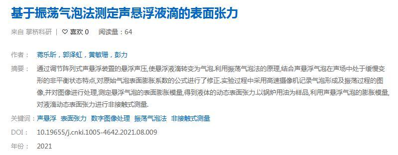 以锅炉用油为样品,利用声悬浮气泡的膨胀模量,对液滴动态表面张力进行非接触式测量。
